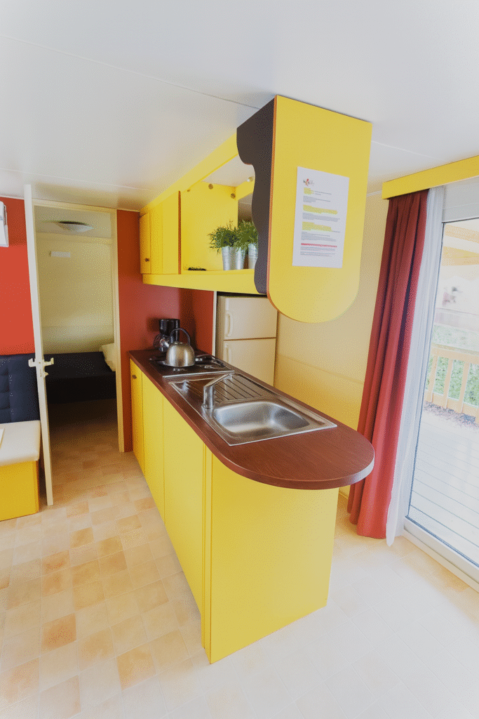 Je verblijft in een moderne, sfeervolle mobile home op een groene en gemoedelijke camping. Alles is aanwezig voor een zorgeloos verblijf: een ruime keuken met kookeiland, magnetron, grote koelkast met vriesvak en koffiezetapparaat, een gezellige woonkamer met satelliet-tv en een overdekte veranda waar je ’s avonds heerlijk kunt zitten.